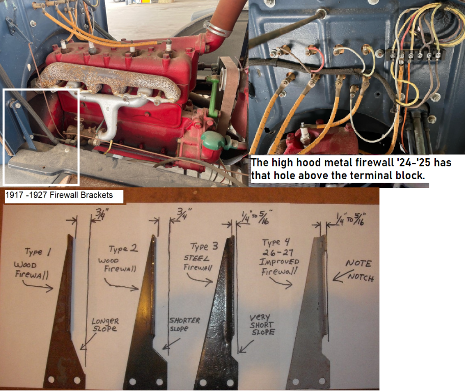 While I was looking at the engine number I noticed that the firewall brackets may be incorrect. Thee shouldn't be a spacer between the bracket and firewall. Likely they are for a wood firewall. The firewall also appears to be a 24'-25' high firewall. So you need to measure the radiator shell to see if it matches. Low vs High requires a different hood. The discussion is long but I don't know if that was covered. Also start to a diary & document what you have and a ledger of your expenses (save receipts). Tax laws are changing and when a Model T is sold the Government will be looking for their "fair share" a tax on a Capitol Gain (sold price - investment cost).