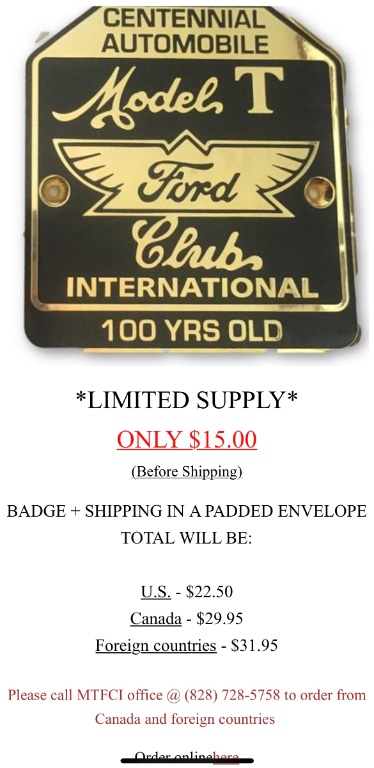 This June our 1922 Coupe will be 100 years old. Last year, in preparation I purchased a 100 year Car Club Badge from M.T.F.C.I.. Mounted direct to the radiator. Granted it was for the celebration for the 1908, still works for later Model T Fords.