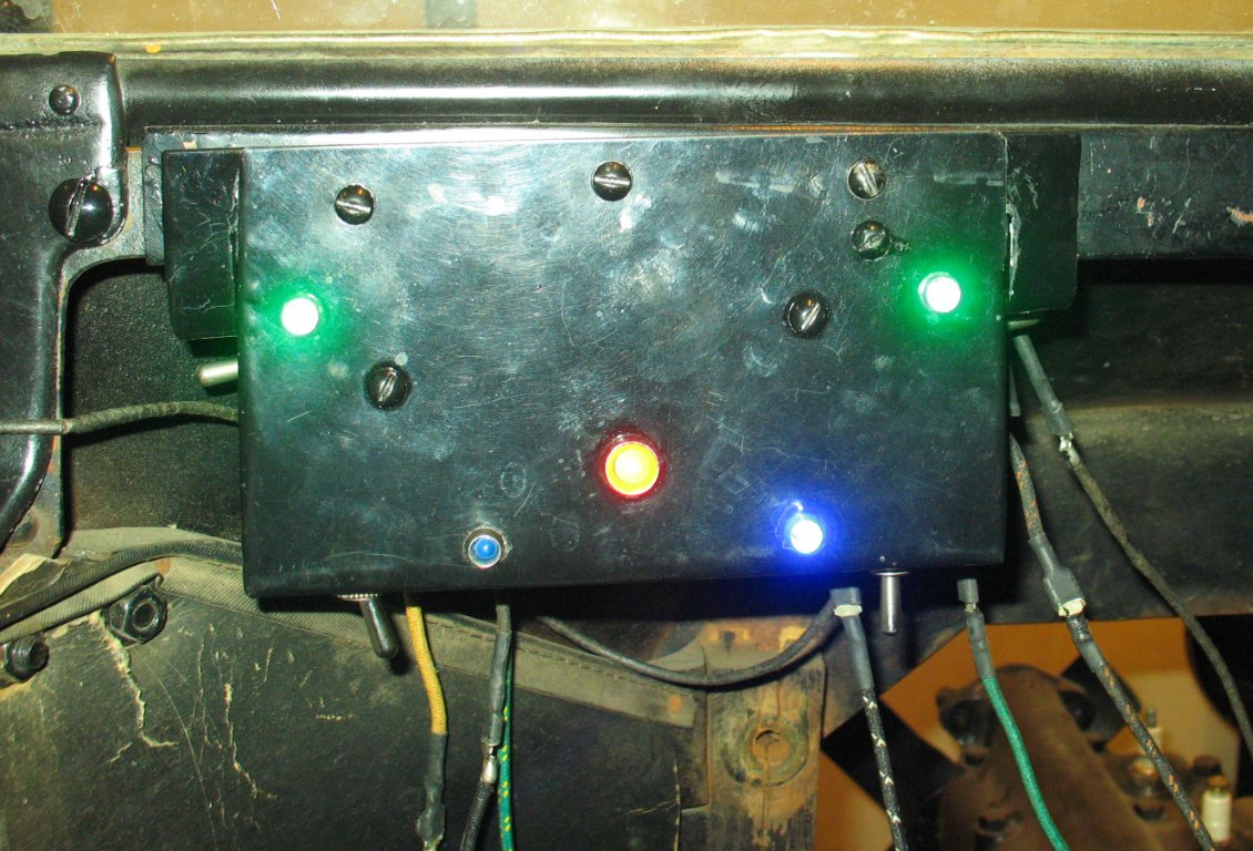 I had this setup sort of finished in February, but I recently decided to add a tail light indicator (bottom right) so maybe I'll remember not to leave them on and run down the battery, and a brake light indicator (bottom left) to let me know the switch is working. In this photo the tail lights are on and the emergency flasher is flashing, but I'm not stepping on the brake pedal.