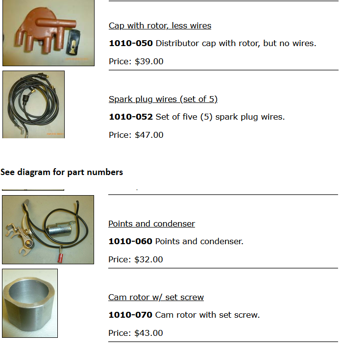 Check your points for corrosion or pitting. Then, with the ignition on, and the distributor cap removed, you should be able to manually open & close the points**. Remove the coil output wire from the distributor cap and let the end lay about 3/16" from the engine block. When you manually operate the points, you should see a spark from the coil wire to the block. This assures that you can actually make a spark. Next step is to figure out why the spark isn't coming through the distributor and getting to the plugs.ecory0 wrote: ↑Sun Apr 17, 2022 12:30 pmFinally got back in the garage. I have power through the switch and coming in and out of the distributor coil. There is continuity through the ammeter. I’m not sure how to test the distributor but given that power leads up to it, I’m guessing that narrows the search down. Thoughts?