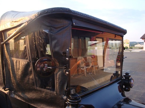 Here is an alternative fastening method shown on a 1919 Model T. I am not sure it is an original design, but if you are making your own curtains, it does not matter, you can adopt the ideas. Here a strap on the top corner of the side curtain snaps to the "storm / wind flap" which is fastened to the inside edge of the top bow and hangs in front of the windshield. The strap that goes around the side light is shown. This example also has straps and cutouts to go around side mirrors and windshield hinge.