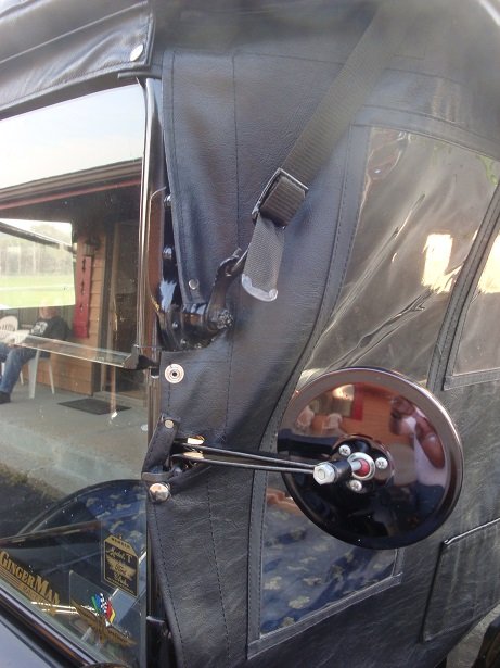 Here is an alternative fastening method shown on a 1919 Model T. I am not sure it is an original design, but if you are making your own curtains, it does not matter, you can adopt the ideas. Here a strap on the top corner of the side curtain snaps to the "storm / wind flap" which is fastened to the inside edge of the top bow and hangs in front of the windshield. The strap that goes around the side light is shown. This example also has straps and cutouts to go around side mirrors and windshield hinge.