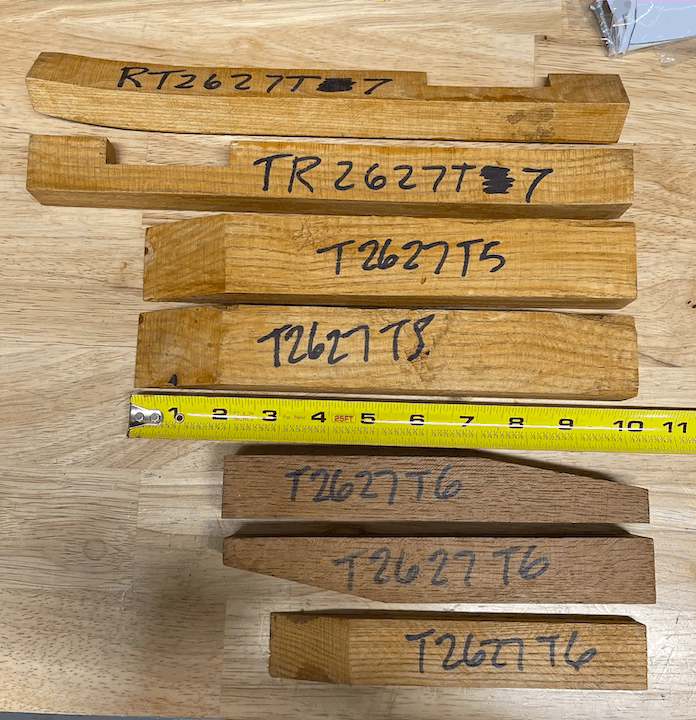 Now on to what I'm trying to figure out. Each part was labeled T2726T and had a number 1-16. I'm trying to take the list from FORD WOOD and match up the numbers so I can use their diagram and see where they go. Here is what I have. That last piece of wood labeled T2627 T6 is the same shape as the other two labeled T2727 T6 but a lot thiner.