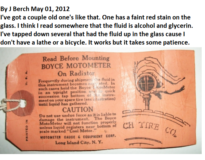 If you lack the proper equipment to "Shake down" a liquid filled thermometer such as an engine lathe, or something of that type, I have read right here on the forum that posters have successfully remedied a stuck Motometer by SECURELY attaching the problematic Motormeter to the end of a rear wheel spoke.