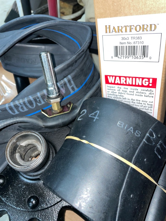 Just rec'd these from Coker, right size 30x3 brass stem tube, and proper 24" flap to go into the 30x3 tire on this all metal felloe clincher 24" front wheel.
