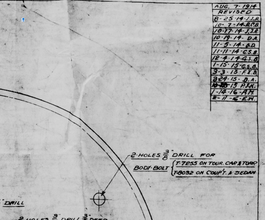 Here we go with that firewall again. The drawing shows ⅜" holes for the two bolts and calls for T-7255 body bolts without giving the bolt size. The bolts used when this car was assembled in the seventies are ⁵⁄₁₆". I'm assuming that the ⁵⁄₁₆" bolts are wrong and they should be ⅜" , but I'd better check and be sure. I've found plenty of incorrect parts in this car, and I figure these are most likely two more of the same. I have the drawing for the firewall, but not for the hood former.