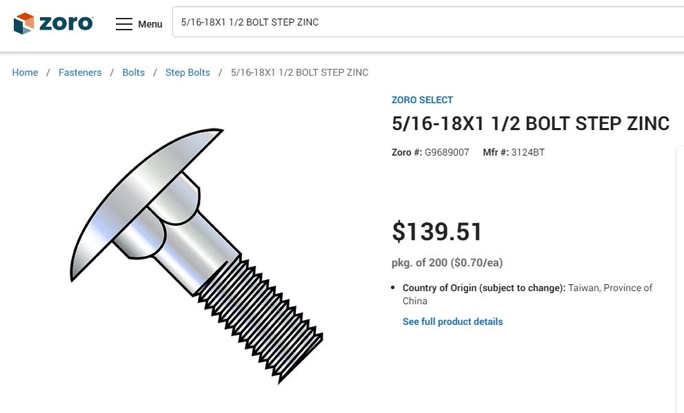 The one good carriage bolt I took out is ⁵⁄₁₆-18 x 2½. Step bolts that size are sold online by the box of 50 for over $35. I'll go with carriage bolts for now and look for the step bolts whenever I'm around a real hardware store.