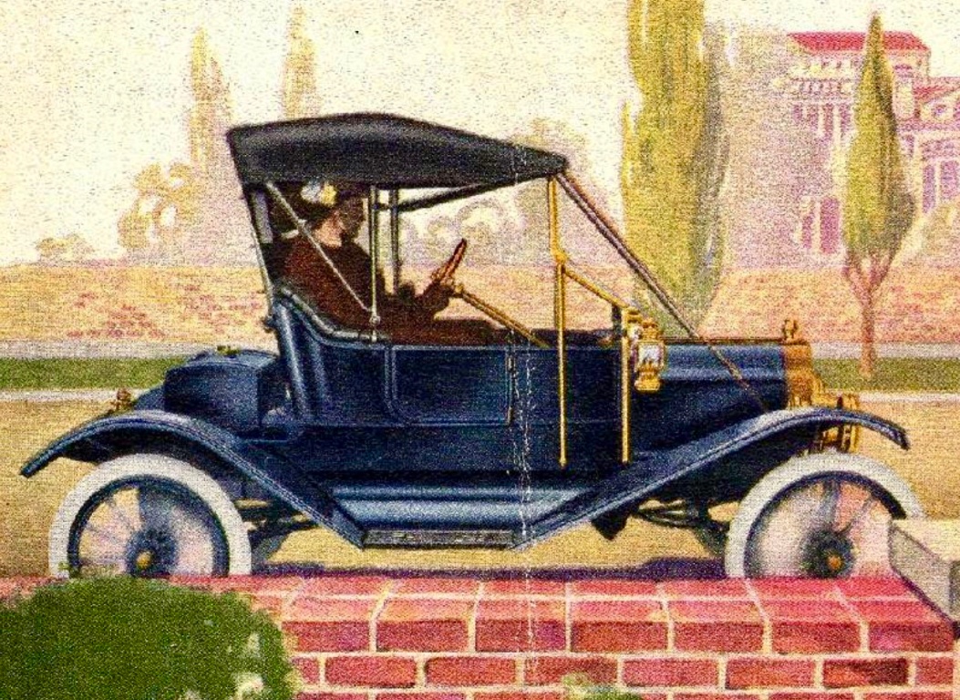 Regarding the artist's rendition of the 1911 touring, I have never seen a period photo of a 1911 that shows pinstripe on the flat panel below the seat riser, nor "boxes" pinstriped on the hood. The drawings also show what looks like brass plated steering column and hand brake. I believe that artistic liberties were taken to enhance the aesthetics of the illustration, including the brighter paint color, to make the picture pop!
