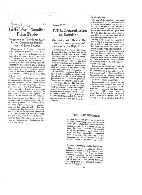 The 6 January 1916 the "Journal The Automobile" (page 39) carried a short article where Congress was concerned with the price of gasoline, and where the Department of Justice was advised to prepare to investigate those responsible for an increase in gasoline prices.