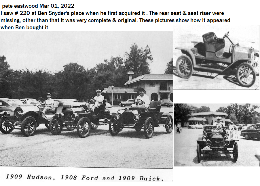 Here is the example of much controversy, mainly because there was little documentation, provenance, maintained over the life of the vehicle. Just hearsay evidence. So this "restored" vehicle has been claimed to be an "original" with engine #220. If you accept that the engine is "original" do you accept that the body is also "original" to the car or just and original body or does it matter . If it matters then explain how it meets that criteria.