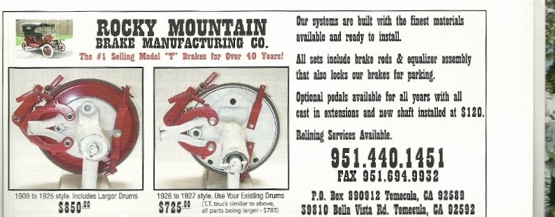 Any external contracting band brake will have wet/mud issues. Any auxilliary brake that uses the original T lightweight stamped steel brake drum will have very limited ability to handle and dissipate heat. That's not a serious handicap in an isolated panic stop situation, but it's a serious problem where the brakes are used for repeated hard stops within a short time, or on long steep descents. A finned cast iron brake drum and modern-type, lined shoes would be a great addition to a T with the larger 26-27 type brakes. The lining would need to be a "fast" lining that would work well witout hydraulic assist. External contracting auxilliary brakes have better cooling for the lining, but only aggravate the heat disspation issue with the stamped steel drums. Watch the Fords slide by....