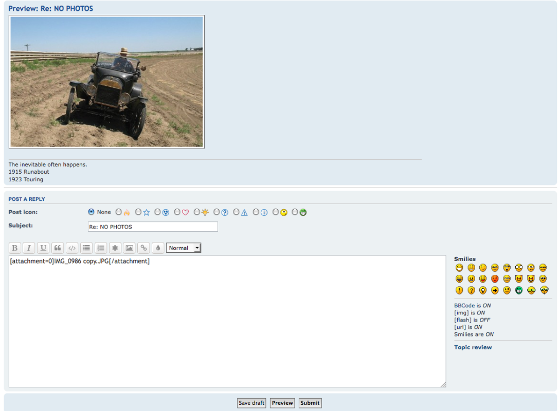 Click Preview. Your photo will appear in the Preview box. At this point you can add text in the composition box, or skip that and post only the photo. Click Submit and your photo and any comments with it will be posted.