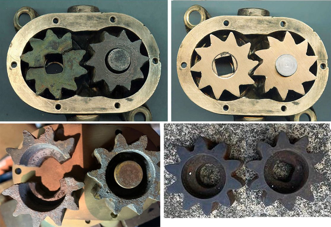 The gears pumped water so much better than when they were restricting the flow rather than making it. Today a fellow posted some original ones on the Brass Buick site. Lower right in this photo. Lower left is another failed pair. I can see what they really looked like originally now. I am happy I did what I did. If I was sure it would be an improvement I would make new ones. But perhaps what I made was a better design.