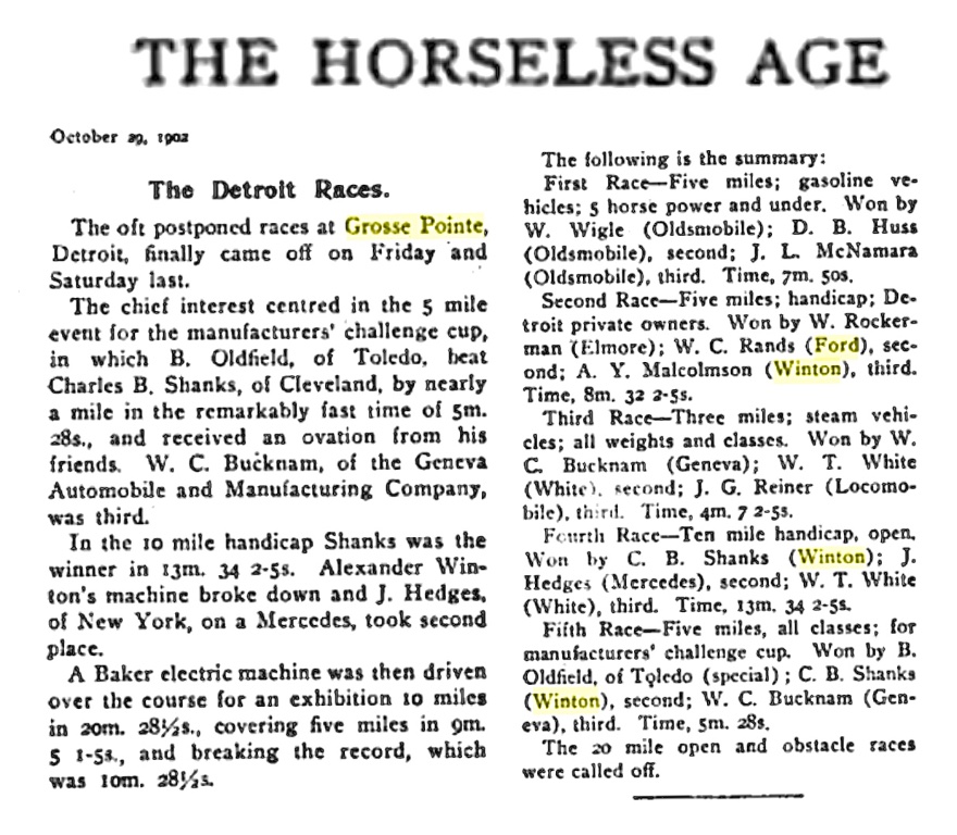Later, Malcomson races a Ford Model A in 1904. Frank Kulick is also racing during these Detroit races, as well as Barney Oldfield and other well known drivers and automakers (Event 2, finishing 3rd):