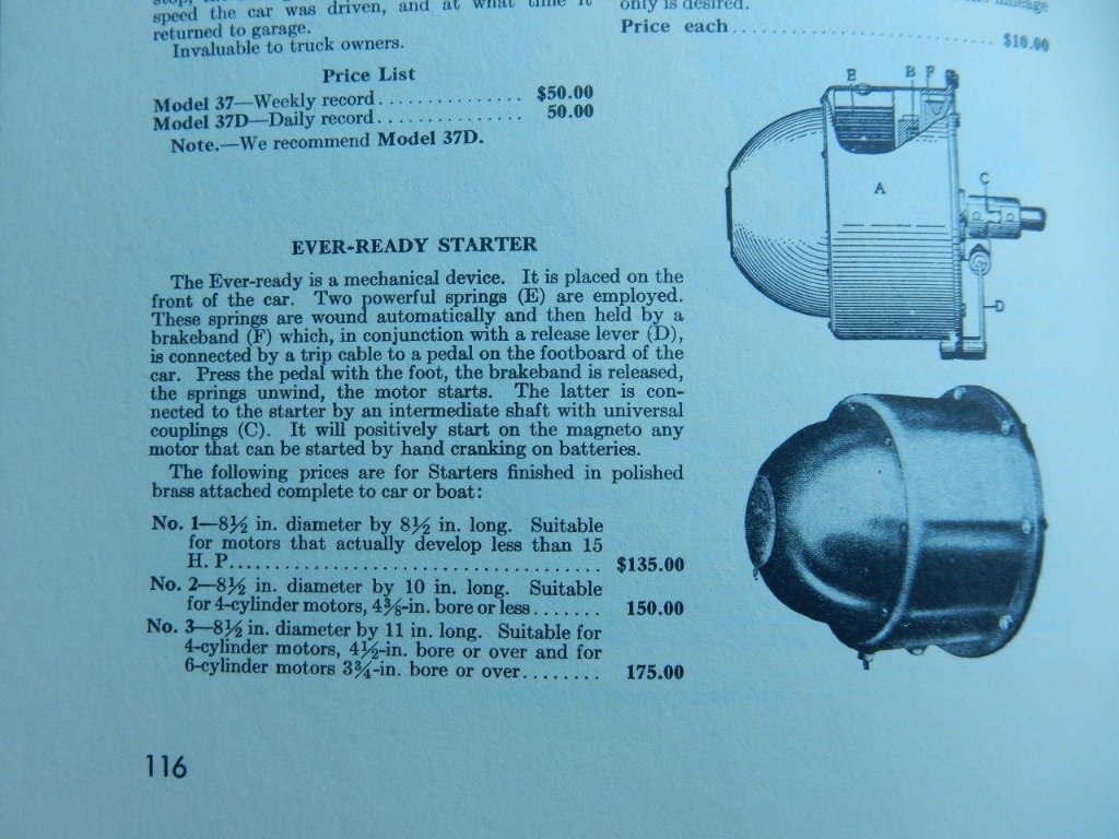I may regret it someday but I have left the stock Armstrong starter on my 1915. For the past couple of years, off and on, I had a hard starting problem and had to crank a lot for a cold start. Recently I started just jacking a rear wheel off the floor and starting in neutral as a regular part of the starting procedure. I usually get a start with two choke pulls and a third pull with the switch on BAT. A couple of times I even got a free start when I flipped the switch. Of course, starting on battery you don't have to pull fast. Even a slow pull should work. If your cousin can manage three pulls, maybe that can get him by while he searches for one of those rare add-on starters.