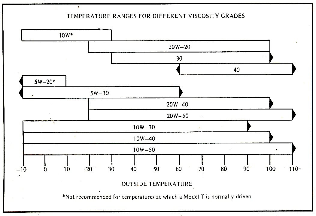 Starting at 0 degrees F, or anywhere near it, is when you REALLY need the 0W phase of 0W20. At 0F, or anywhere near it, a good quality straight grade 0W, 5W, or 10W is just fine for lubricating a cold Model T engine, transmission, and clutch. HOWEVER, as the engine and the oil WARM UP, any of these might be a little on the thin side, though I doubt the 10W would give any problems in freezing weather, even if you drove all day. A 0W20 synthetic, or similar multi-grade oils, WILL NOT thin excessively when a cold engine warms up, even under very hot weather conditions and running at highway speeds for many miles. It WILL NOT thicken to the point of causing starting and lubrication problems in very cold weather. In short, synthetic multi grade oils with a low first number are ideal for Model T Fords. They exceed Ford's recommendations, coming and going. It's not that hard to understand, and it's not my idea, and I do not sell oil. I do drive a Model T in hot weather at 40-45 MPH rather often, and I do use 0W20 and 10W30 synthetic oil. I also use it in a couple of high output, hot-running, late model vehicles which demand a lot more of oil as far as bearing protection at high engine and oil temperatures at high speeds and high loads than does a Model T.
