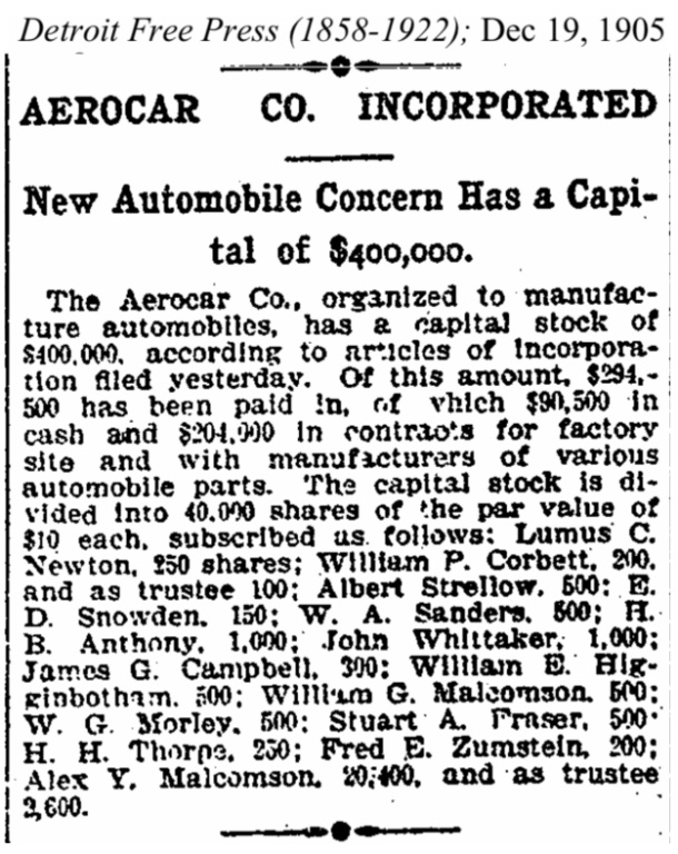 Similar to his investment in Ford Motor Company, A. Y. Malcomson's cash investment was minimal in Aerocar, but he held the majority of shares. According to this report, he held 23,000 of 40,000 shares issued. His cash outlay was minimal, contributing the land he purchased in 1904 for $14,000, as well as various contracts: