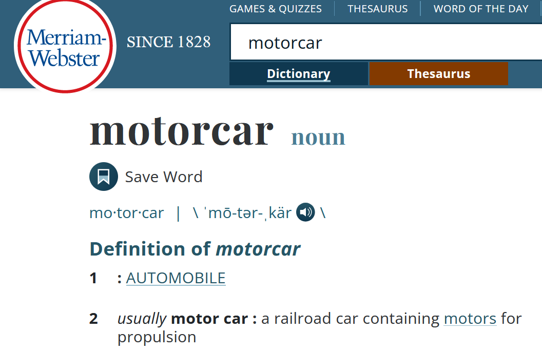 "Motor car" was of course one of those English terms. It was also a colloquialism. A term in common usage in some areas, practically unknown in many other areas. "Motor car" was also used for railroad cars, large or small, that had their own motor, and could be run down the rails without the aid of a railroad engine. They were often service vehicles to transport workers to places in need of maintenance or repair. They were also rail busses transporting workers for lumber mills or their kids to school. They were in fact railroad "cars" with a "motor". For a lot of people, "motor car" should be used only for railroad cars!