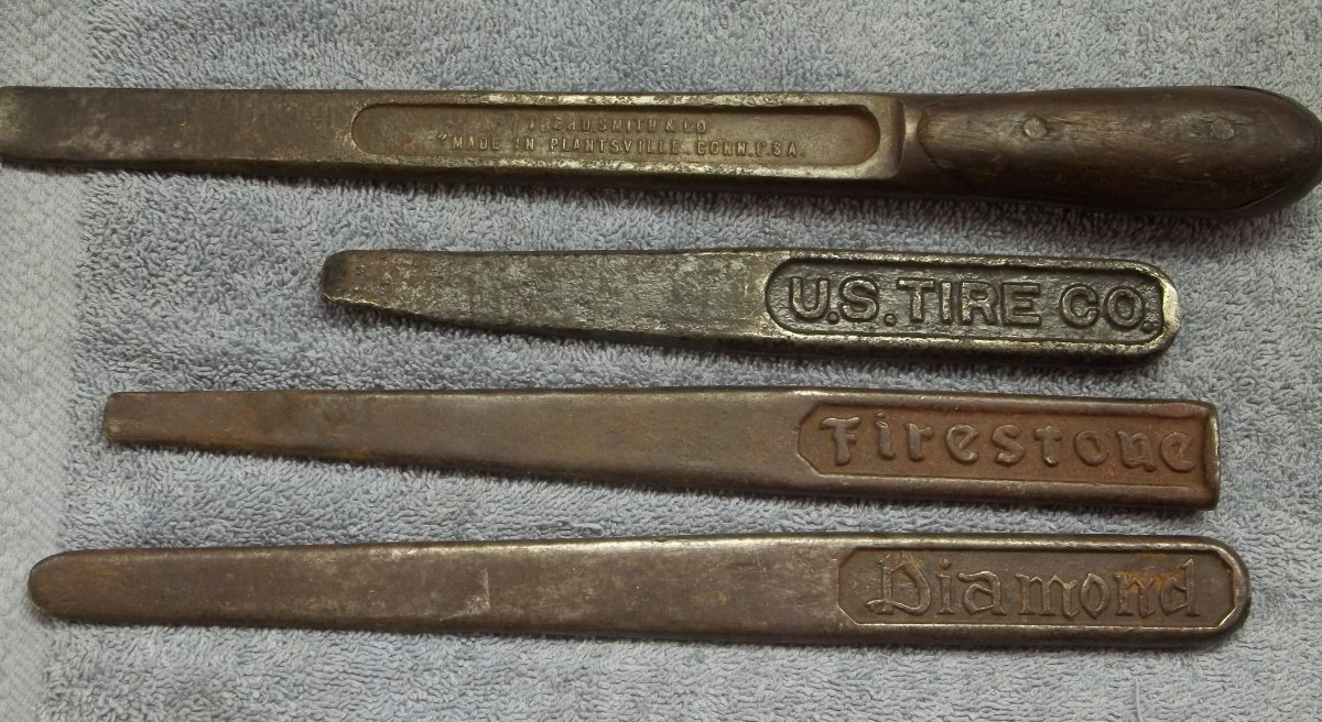 I had the opportunity to acquire these tire irons from the estate of the late Phil Knighton, along with some speedometers and clocks. I was unaware of the variety of tire irons produced by tire manufacturers. I know that some of these tire irons were included in early Ford tool kits (Diamond and Firestone) but I don't know if any others were included in the kits. Russ Furstnow