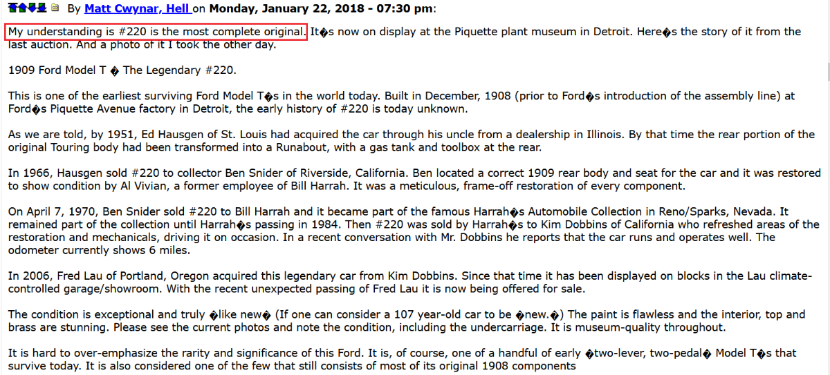 Your quotes from Kim state that the rear seat was missing, not "the body". Most people are aware of and accept this, including the current owner. Where has anyone stated that 220 is "original"? You have repeatedly bashed this car. Not sure what you've got against it. Kim has also stated elsewhere, that 220 is one of the most complete 2 lever cars still in existence**.
