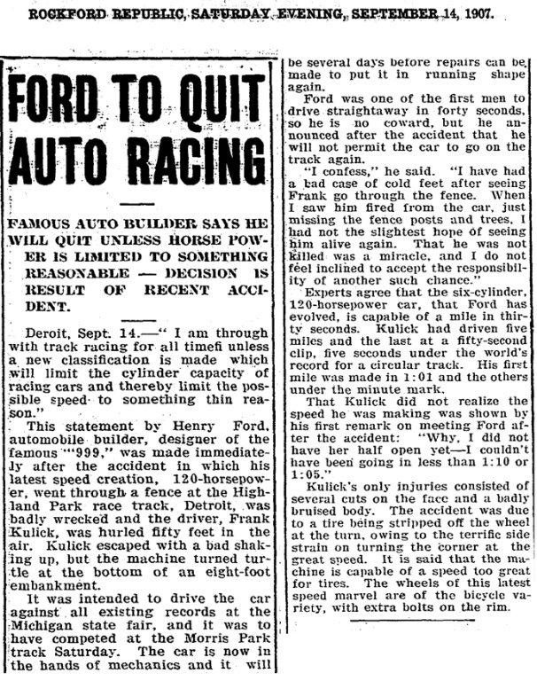 One hundred and fifteen years ago today, Henry Ford declared he was finished with racing, following Frank Kulick crashing through the fence surrounding the Highland Park one mile track, after reeling off unofficially lower times than the circular mile world record, driving the third iteration of Henry Ford's six cylinder racer.