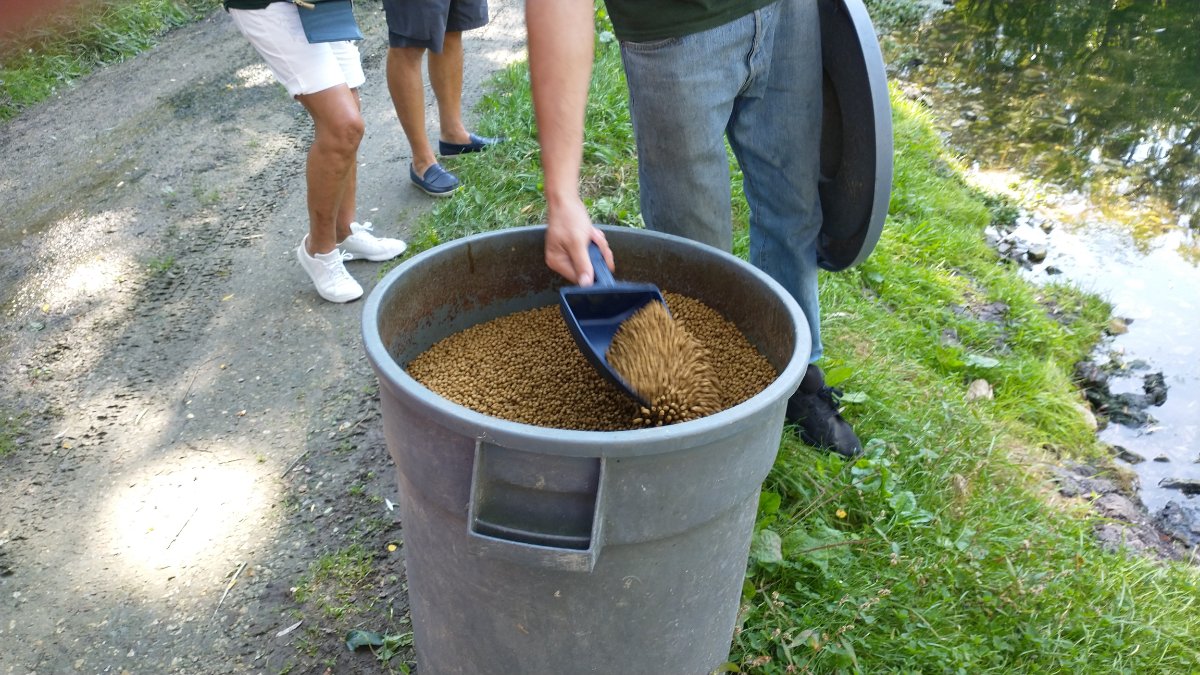 The eggs are placed in these tanks to grow into fry. They use nets like this to move fish from pond to pond. Here is the high quality fish food that they throw out over the water. This garbage can is filled every 3 days. The mass frenzy as they throw the food out over the water.