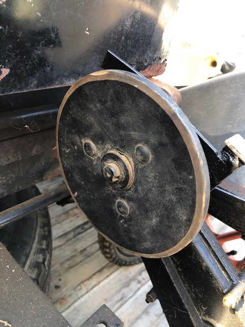 The pulley on the engine has two grooves, the groove closest to the engine is cut so that the reverser disc will mesh inside it and cause it to turn in the opposite direction. The outer groove is adjustable and takes a 3/8” wide belt which drives the pulley the reverser disc is mounted to.