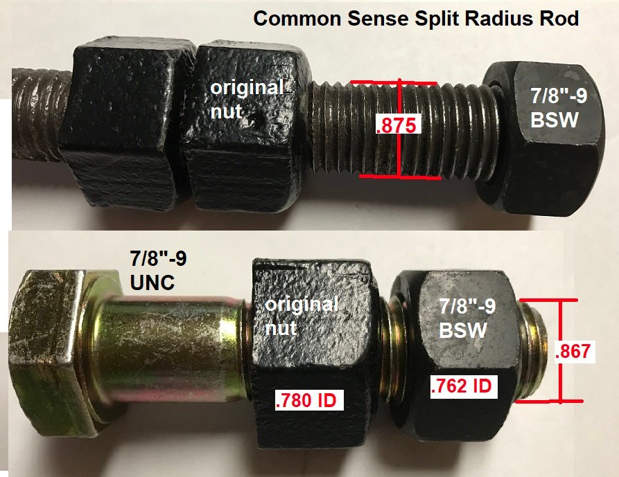 Have a set of Common Sense Split Radius Rods. Need to do a bit of thread repair on the long radius rods. Problem is that while the original threads appear to be 7/8" 9tpi replacement nuts don't fit. The new nut & original nuts fit on a new 7/8" - 9 bolt but only the original on the radius rod. The new nut is BSW. I also have a 7/8" - 9 NC die that doesn't fit the radius rod. Posted measurements. That's all I can get the new nut on the radius rod. Any ideas about a difference that is causing the fit issue. Shouldn't a 7/8" bolt have a .875" od on the threads?