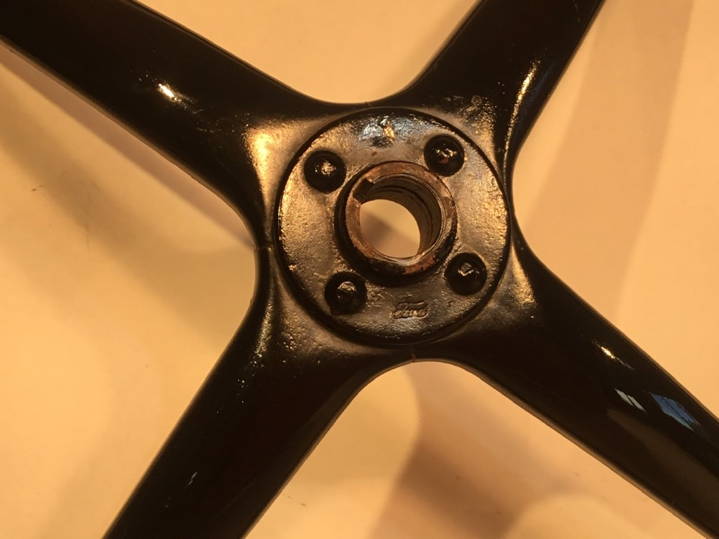 Bronze spider. Redesigned wheel now 12-3/8” I.D. and 1-1/8” thick (14-3/4” O.D.) wood rim painted black. Bronze spider believed to have been painted black in later production.
