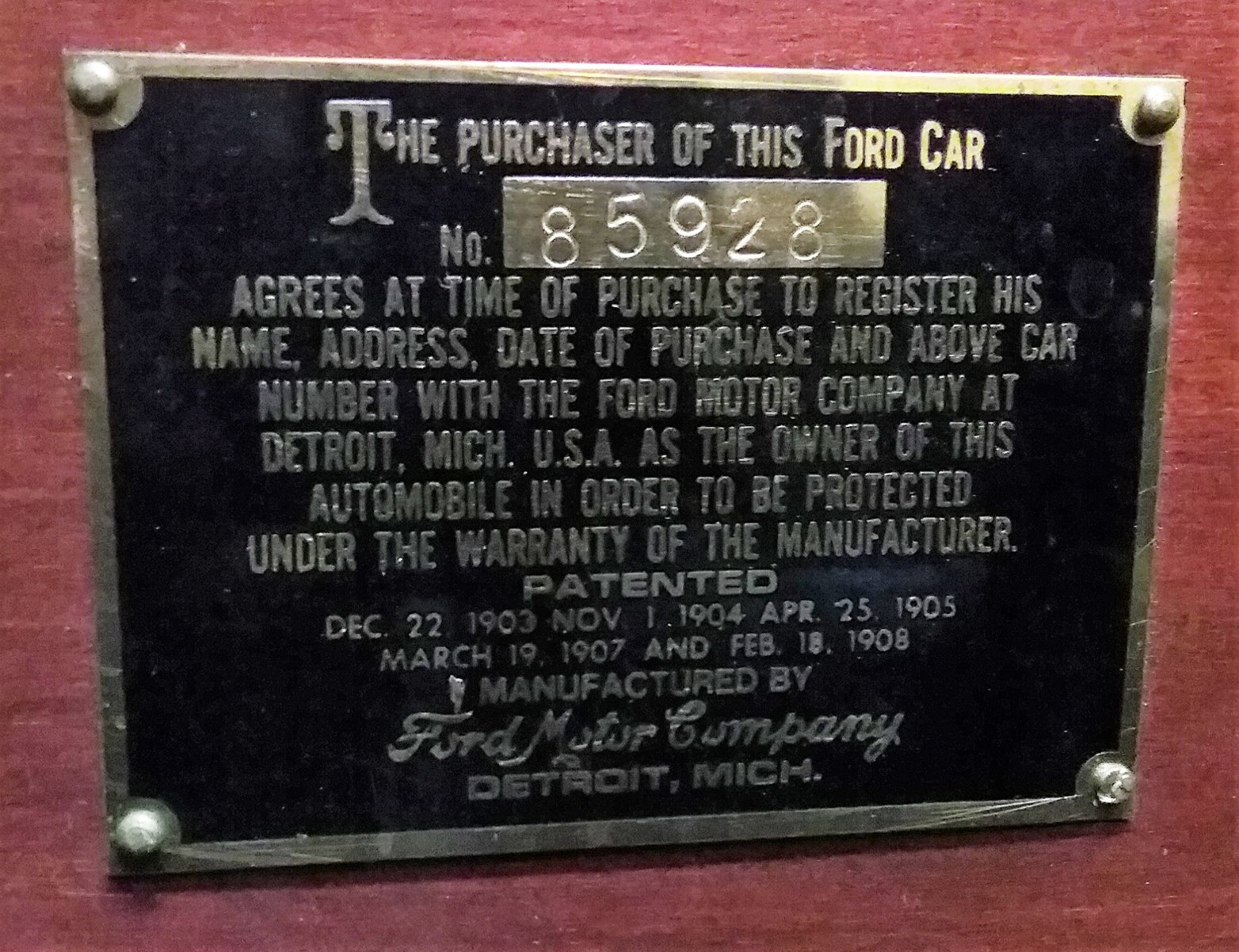 By the time my car was built, the number on the dash board patent plate did not match the serial number. This one is 403 away from my serial number which makes it an appropriate (although not original) number to match the car.