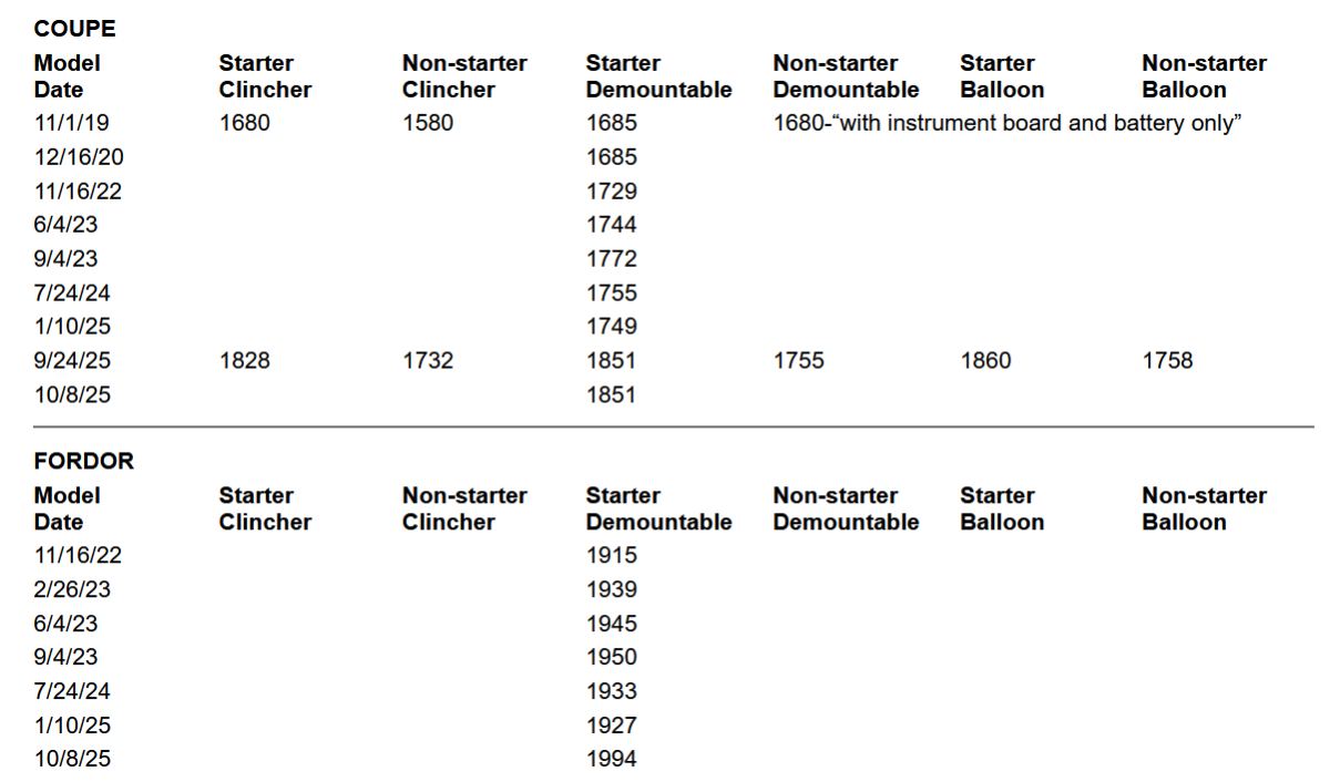 I don't presume to know, this gets complicated pretty fast, but it would seem the numbers don't provide consistency. Just in the first three lines, chassis with starter and clincher rims gains 70# from 1919 to 1920.
