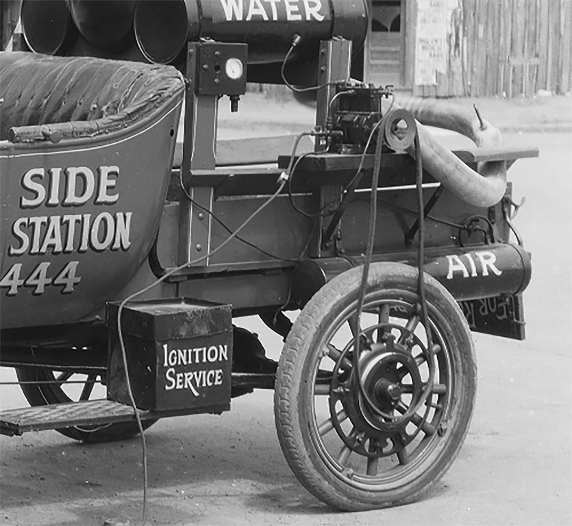 It's got some sort of pulley or sprocket on the left rear wheel to run the compressor. I'd guess it's a pulley for a link belt, which he may have slipped off and on as needed. That would require jacking up the wheel, unless he had some kind of "dog" or other arrangement to allow the axle and pulley to run independent of the wheel. I can't read what it says across the bottom of the picture, which may have been taken in Breckenridge, Texas. I know that some early businesses had similar phone numbers, and East Walker Street has a hill very much like what the picture shows, and there has been a gas station/garage near the top of it for as long as I can remember. Looking down the hill, there is something that could be a wooden oil derrick. All of that would be consistent with Breckenridge in the 1920s.