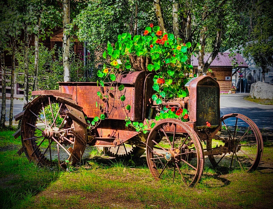 The red tube has found its way out into the sunshine. Like the caterpillar into a butterfly or a tadpole into a frog the metamorphosis of the old car tire brings beauty and wonder to the back yard. Shredded cords and chunks of hardened rubber give way to splendor in the grass.