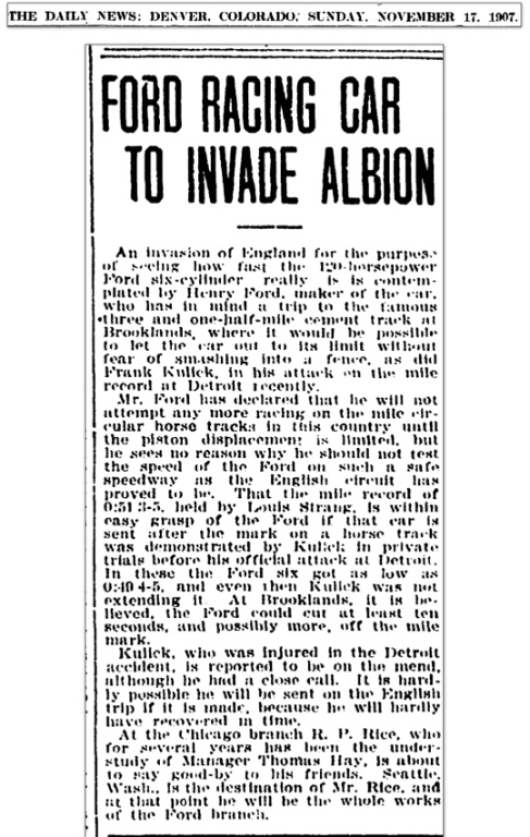 It seems Henry Ford was interested in seeing what his six cylinder racer was capable of on a proper racetrack, and considered sending it the Brooklands in England. The idea appeared again in the media in November, 1907: