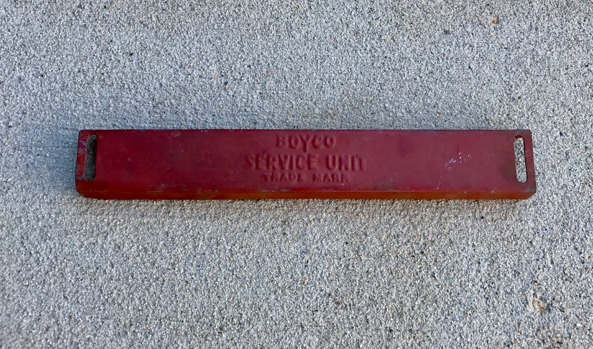 Very hard to find original running board can Boyco Service Unit hold down clamp. This would rest on top of the Boyco can lids, and straps would hold it in place. 12 inches long. Stamped steel. 60.00 includes shipping.