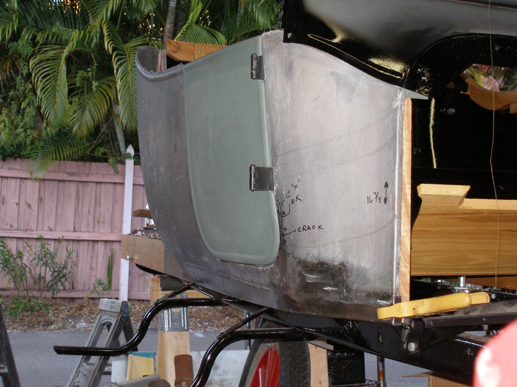 The body is moved back 2" on the frame to clear a Rajo head.(presumed) The rear fenders are flattened some (larger radius), but mount on the body & running boards stock positions. The rear doors just clear the fenders.