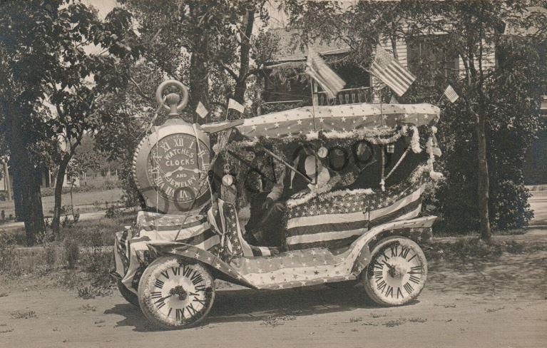 The decorated clock-themed car is not a Ford; it has frame horns for longitudinal springs and there is not Ford flywheel housing visible between the front tire and fender. The radiator is too far forward, too.
