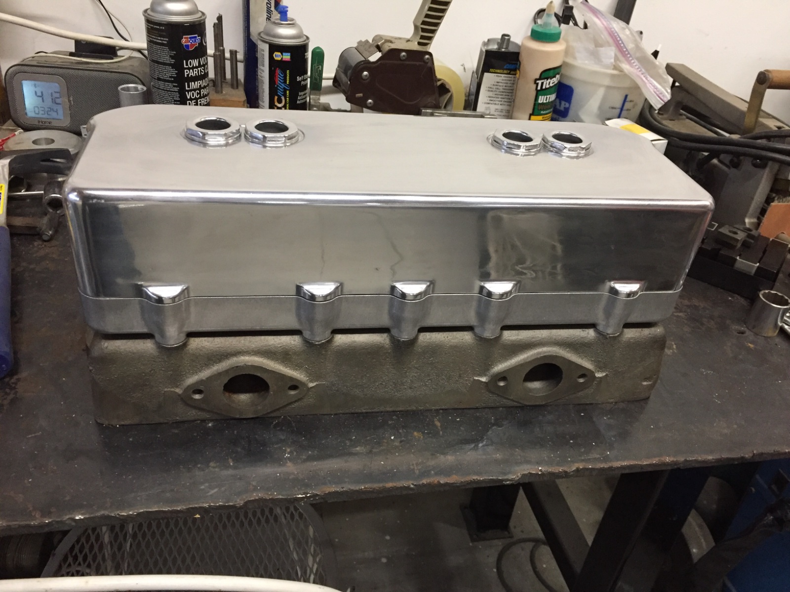 So... I’m finally back on the Akron-Hed track after a year and a half of machine shop confusion and carburetor creation. Spent the morning warming up the head enough to pack epoxy into the intake ports, sealing up the auxiliary intake passages that connect down into the stock intake ports in the block. When the epoxy cures, I will set the head up in the mill and drill/ream the epoxy plugs to accept new push rod tubes.