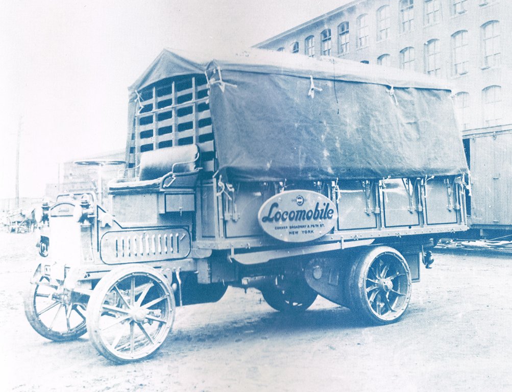 The radiator looks like either a Locomobile or a water-cooled International, but I can't find a contemporary photo or ad for either that decisively confirms it. The flat-fronted and shallower radiator top tank seems to rule out Peerless.
