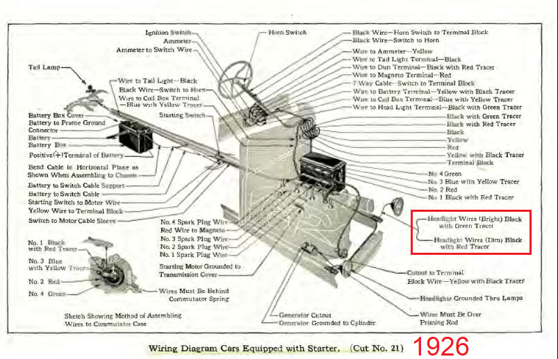 The two bulb headlamps were used in the 1919 and 1920 starter equipped Ts. They were battery powered. Dual filament light bulbs weren't available, or at least not used by Ford until 1921. Thus two single filament bulbs were placed in the headlight buckets a low candlepower one for DIM and a high candlepower one for ON. With the non-starter cars, beginning in 1918 a dimmer coil was introduced which had two settings for dim and bright. The column mounted twist style light switch (1918-22) had two wires which connected to the dimmer coil in two different places on the dimmer unit, thus providing different amounts of dimming. From there one wire went to the headlights, wired in series. These were single bulb headlights and were magneto powered.