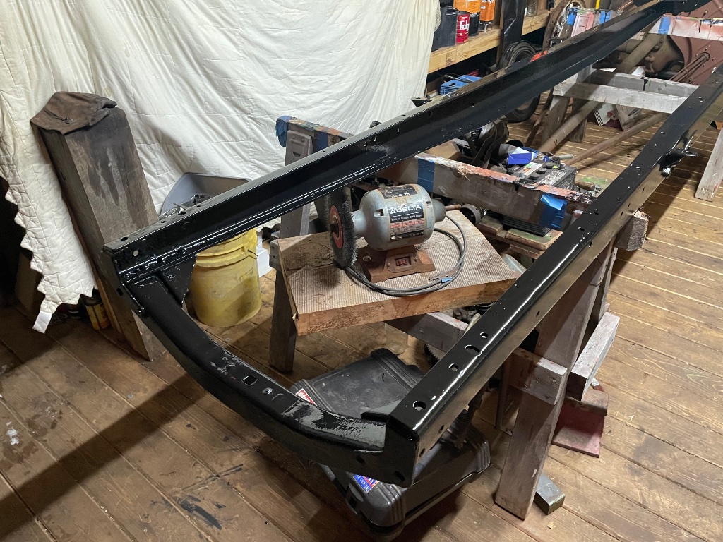 Still healing up from a full hip replacement in late Dec but I have been trying to pick away at the TT as pain allows. Today I managed to finish riveting the replacement correct front crossmember. It took me several hours to make the different back-up bucks that fit tight between the rivet head and opposite frame flange. I had to do this as I work alone. I brush painted the entire frame using RustOleum gloss black with the TSC enamel hardener catalyst. I am anxious to see how it drys now as this is the first time I have used that hardener. I am excited to start hanging parts now!