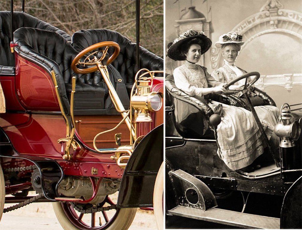 I can't tell if it's a flywheel or road wheel that is barely visible to the left rear. I wonder if that car had outside lever controls that were removed to make getting in and out easier. There appears to be an opening just below the lady's dress that might have been for a control shaft and lever or levers.