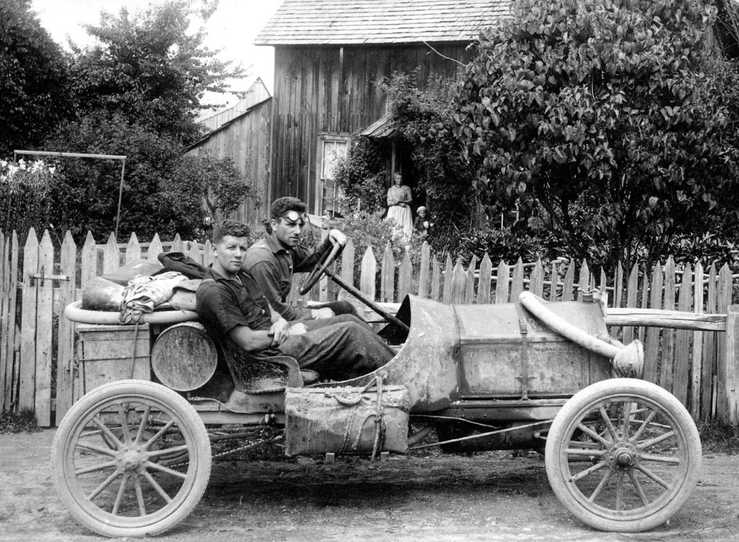 This photo has me pondering what motivated "motor boys" to build speedsters in those early days as opposed to how modern day builders of speedsters approach the problem. This photo shows a vehicle stripped down to essentials for a mostly roadless cross-country trek over wagon roads and cattle trails. It's packing gear for roughing it, and making spot repairs.
