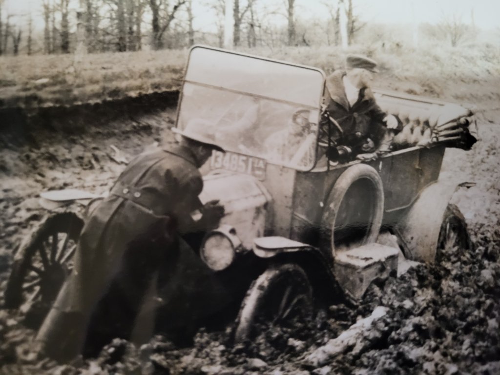 My take on this is the photo is somewhat staged. The fellow "pushing" on the radiator is wanting to look like he's actually helping rather than just standing around looking helpless ! I would never push on my T's radiator and expect that to help it move, even on dry pavement ! I think the fellow backing up is watching out to make sure he doesn't find the same soft spot in the quagmire that got the other car stuck. From the amount of exhaust his car is spewing, either it's a very cold day (but the mud's not frozen) or he needs a ring job badly, or he's really pouring on the coal ! I'd guess the last one in that heavy mud ! What a great picture !! Lots of good comments.
