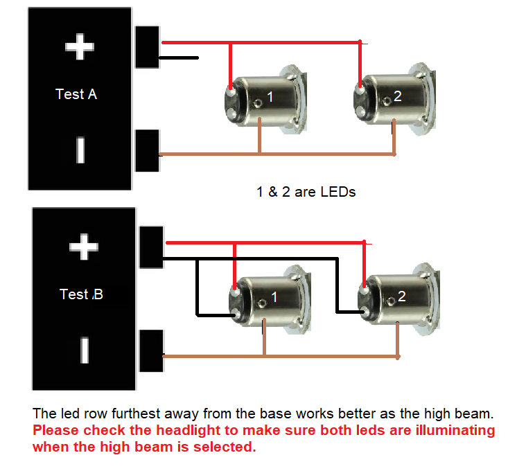 However as Matt has also said the LED will work ok with an incandescent bulb connected it suggested to me that (a) the LED was ok and (b) that what he actually did was run a wire from the battery +ve to one of the socket wires/connectors on the headlamp assy.