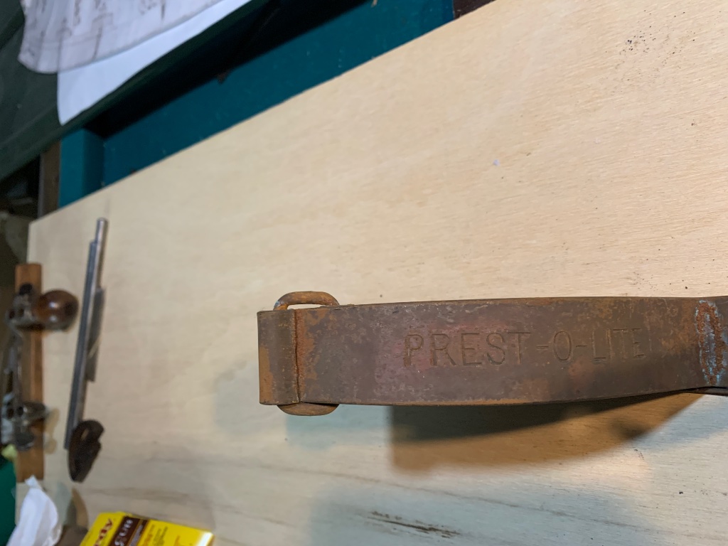 Here is a nice set of the strap style prestolite brackets for a B tank. These have the prestolite stamping in them. These will clean up very nice. They have the thumb screws and toggle bolts that turn freely. $100 plus shipping