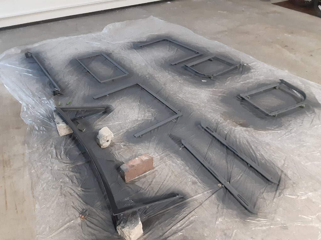 Splash panels painted and restored items in storage shed waiting for body to be painted.