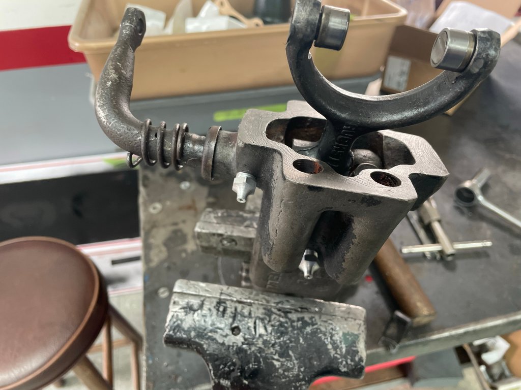 Additionally, I replaced the original plunger spring with a lighter weight spring which still holds enough tension however takes less lever pressure to move. While I was in there, I noticed there really wasn't any lubrication coming up from the differential lube, so I took the liberty to install era-authentic grease fittings where I can add grease to the plunger & roller area, and to the shift lock arm area. Hopefully the grease around the shift lock arm will slow down the access of water if we ever cross deeper bodies of water again. Also, lesson learned for me about checking rear ends after tours where we cross creeks.