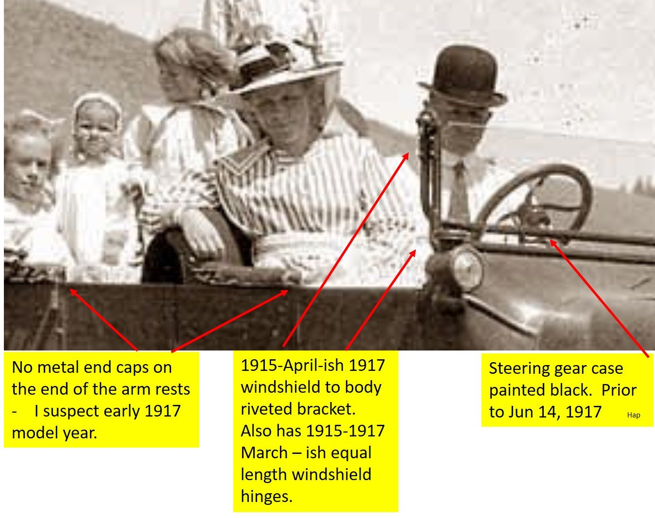 Riveted style windshield frame and brackets were used in 1915 and 1916 and on the first 450,000 1917 cars. (Until about April 1917.)