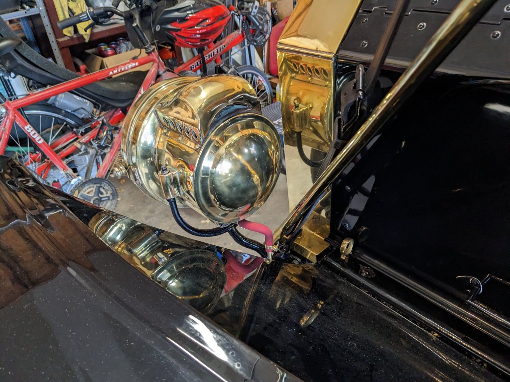 Saturday I finished up the my restoration of our 1911 touring car by reinstalling the headlight plumbing, including the correct style hose and clamps from Langs.